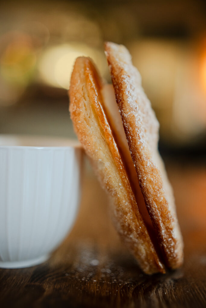 Serveras på levainbröd. En röra med räkor, färsk dill, purjolök, majonnäs och smetana.